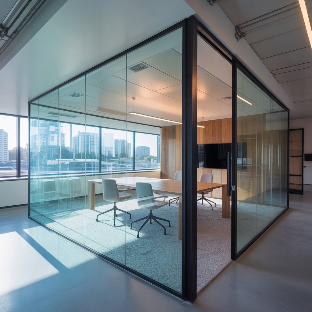 Modern office Cat B fitout with glass meeting room, workstations and finished interior