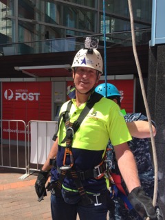 Bryan makes it down safely at the abseil to support the Sir David Martin Foundation.